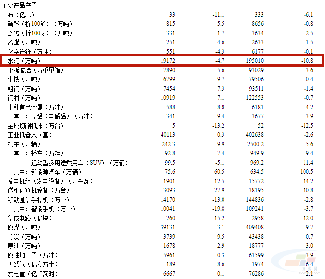 2022年11月份,水泥產量19172萬噸,同比下降4.7%;1-11月份,水泥產量195010萬噸,同比下降10.8%。